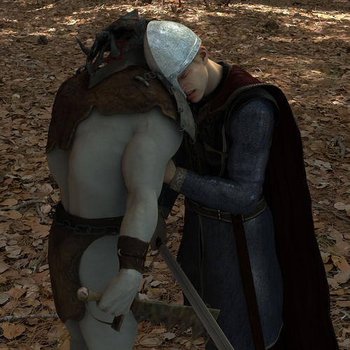 Gorm takes down one orc but got hit himself, not bad but a bruise. Eirik keeps two orcs busy while Lomund drives his spear right through the eye of an orc and it falls down dead to the ground. Miriel now jumps of her horse and shots an arrow in the flight, hitting another orc. Eirik is getting bruised too while taking the attacks. The air is filled with the sounds of metal against metal, cries and pain. Lomund draws his dwarven dagger and attacks and hits, but is hit himself, painful. everyone is getting tired fast. After a few minutes of fighting Gorm and the last of his orcs are looking like teenagers dancing in grammar school, clinging on each other trying to regain enough strength for s final blow.