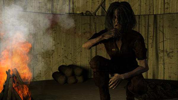 Inside, there were crude paintings on the walls of monsters with sharp teeth, or it looks like monster anyway. On the floor was a pile of leaves and a small fireplace, and from the roof skins of squirrels and rats were hanging for drying in wooden frames. There was a really foul smell in this room.