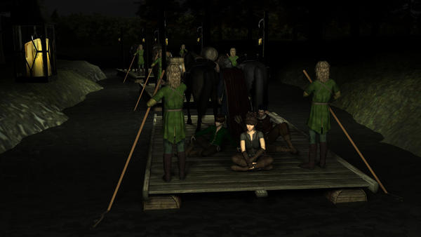 They loaded the ponies and the horses on the rafts, but the animals seems to be scared, so the elves whispered softly in their ears, and then they calmly walked onto the rafts. It was a silent journey along the winding river in the dark, only lit by the lanterns on the elven rafts.