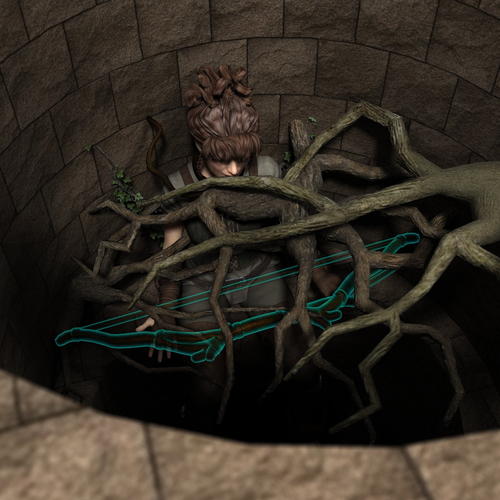 While Lomund fought his way to the well cutting of several roots and getting splashes of dark blood in his face. Miriel woke up from her dream as something was trying to strangle her. The bow, it was so real, she had felt ir, now she was entangled in an inferno of moving roots. She quickly wiggled herself out of the strangling grip and tried to reach the edge of the well.