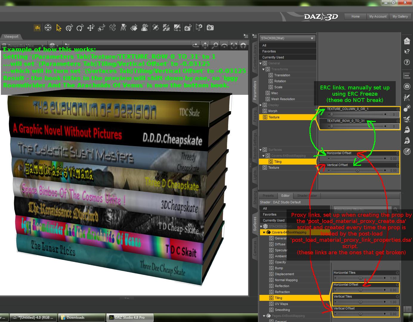 Maybe I'll create a version of the prop with an Iray material but without any ERC or proxy linking. With a note in the readme that if an Iray user wants to change the book selection they'll have to do it manually via the tiling offsets on the surfaces tab. With multiples of -0.03125 for the vertical offset.