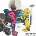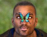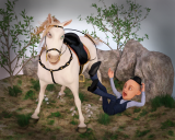 REPURPOSED ITEMS: I had fun with those one! There are only a handful of elements in the image: the ground,the male figure, the figure's shirt, and the butterfly. But if you look closely at the butterfly, you can see that the body of the butterfly consists of a women's glove constructed with 2 different components. The base of the body is actually a long black woman's glove, posed with the index and middle finger pointing outwards in a 'V' to mimic the appearance of a butterfly's antenna. Encircling that glove is a bracelet and arm chain, which gives the illusion of banding on the butterfly's body.