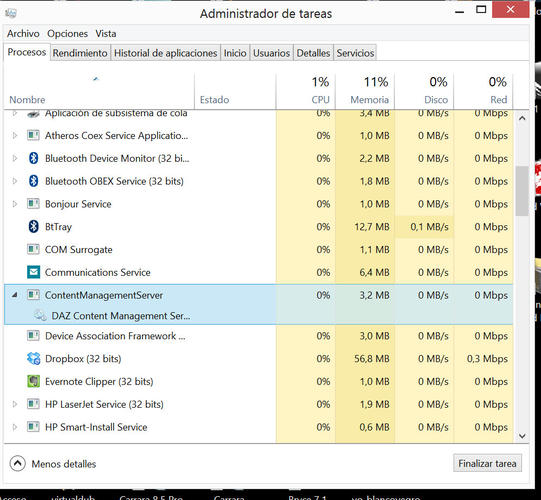 I attach a screenshot of the running Windows processes. The "Content Managment" is marked blue.