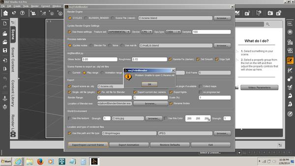 “Problem: Unable to open C://scene.mtl” (with both forward-slashes) appears every time I try to run McJteleblender2. Both scripts were extracted properly in their respective Daz 4.6 and Blender 2.69 program folders, as near as near as I can tell, and it’s doing this on both my laptop and desktop, which are both Windows 7 64-bit.