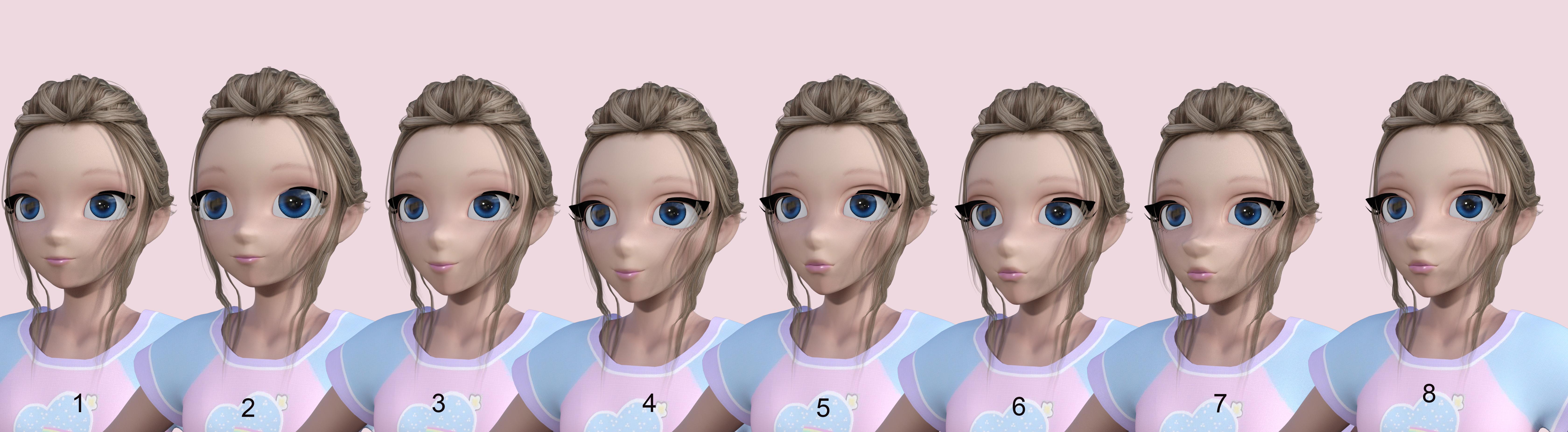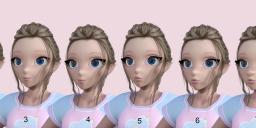 4 - Changed eye shape and added toon lashes. The lashes cut into her hair but that's because I applied the lashes after I put the hair on the character.