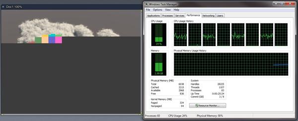 I was rendering volumetric clouds using a surface replicator, and noted render time was terrible. Below is the image I was generating and the Windows Task Manager. When I render a basic cloud with surface replicator, the app only uses 4 of my 8 available threads, and each of them only at about 40-50%. That's about a 20-25% use of CPU resources.