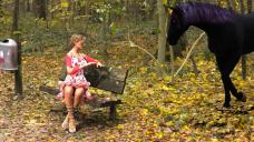 The background is an HDRI and the only geometry is the horse, girl, leaves under the horses hooves and two matte planes to catch the shadows on the bench which is part of the HDRI.