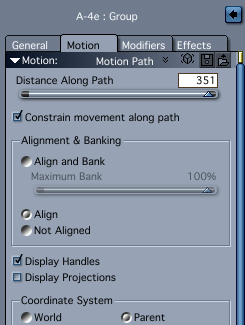 When you have your path, move to the end of the timeline and in the motion menu slide the Distance Along Path slider to 100%. I would leave the bank and align options off if you're animating your camera, because you'll want to aim it yourself at various points along the timeline.