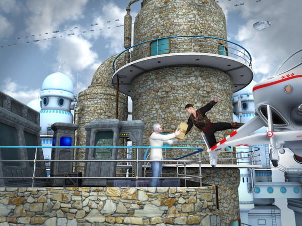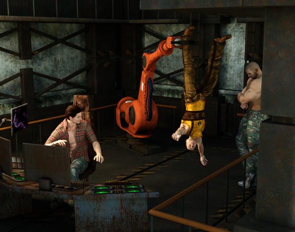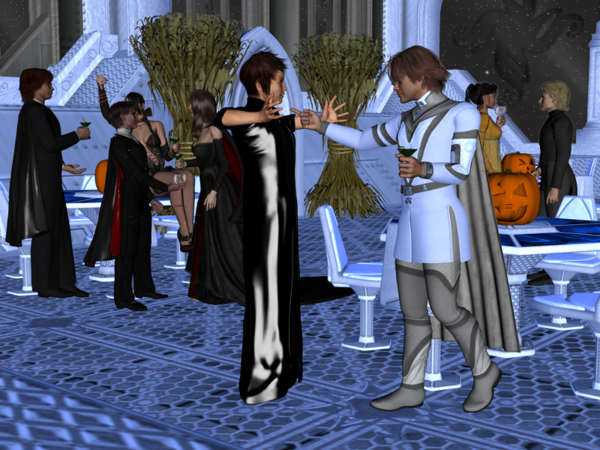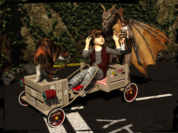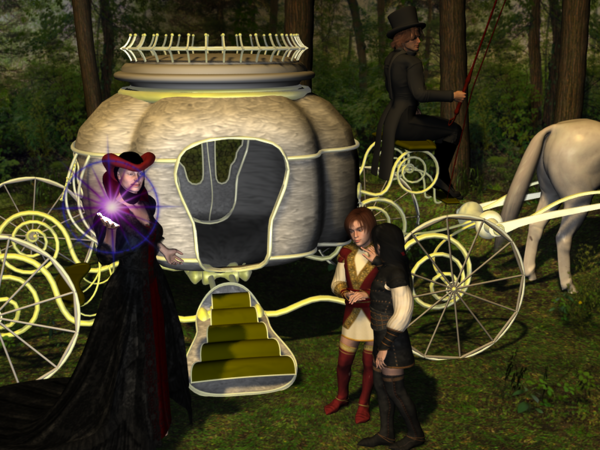 This one turned out to be a real beast! (Mostly because - hell, you know me; "nothing in moderation!") Characters were built in Poser 9, and the scene was assembled and rendered in DS 4.6, with a bit of post-work in GIMP. (Yeah, that damn alpha-channel reared up and bit me on the tuchus. Again!) And the render damn near brought DAZ Studio to its knees!