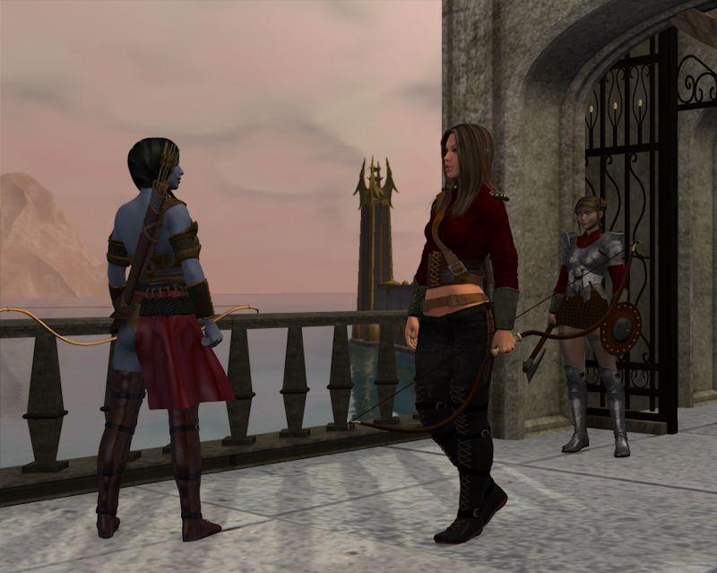 This render is set in Everquest 2, in Freeport. The backgroud screen is taken from my Manor Balcony overlooking the Harbor wall. One nice thing.. I loved the sunrise sky but tired of fighting facing into the light, so, I just waited till Noonish, Game time, and took a new shot. No more water shadows fighting with me. Fixed the lights, feet, few more details. I'm sure more will crop up, they always do. Did some fiddling on the background scheme, camera DoF doesn't effect it. Also included a pic of my cheap, freebie set, a plane and a jumble of free tutorial set elements. Free is good on a small fixed disablity income :)