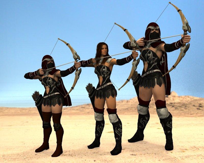 Ok, over Christmas I treated myself to a few things, also finally making the dreaded process of moving my older girls to G2. I got the Dark Sisterhood set. I really like it, but.. always a "but" with me. The bow is just great. I disliked the bathing suit appearance of the main suit, adding the LOFN short skirts fixed that for me. The boots are clunky and have that sabot thing going on, but they aren't spike heels! Yay for that. The cowl and short cape is pretty awesome. The archery pose is good, but, adds a strabismus issue to the eyes. You can see it in the center char, the cowl hides it on the other two. I have no clue how to fix it in G2.