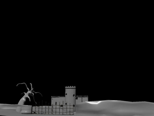 Everything in the scene so far modeled in the VM. The castle and tree extruded from cylinders; the tree bashed about with the displacement tool. Ground is a much-tessellated grid, again used displacement, also on the walls, which are elongated cubes. The gates are simply a bunch of elongated cubes. Now that I'm learning a few tricks of the VM, I'll make them more ornate.