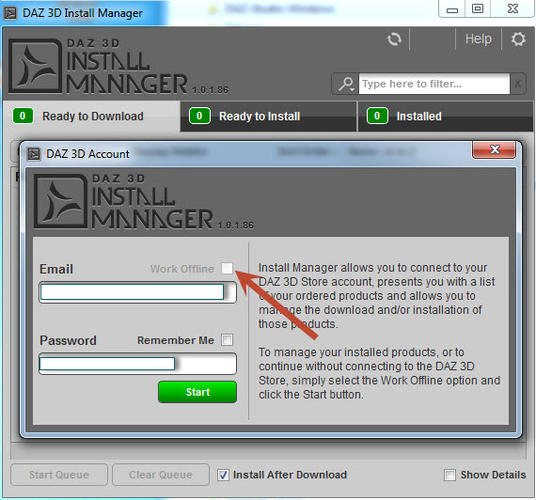When I start DIM, it asks for an e-mail and password for my account(I should not need that to work offline). But if I cancel that, the DIM exits. So I enter the info, but it then wants to connect to DAZ (As I mentioned in my earlier post, I do not have my workstations connected to the Internet). The option to "Work offline" is greyed out, cannot enable it.