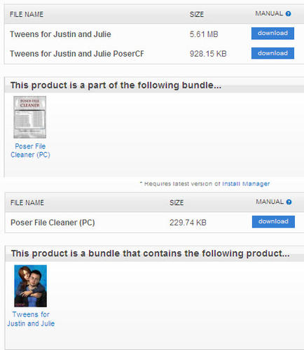 DIM has already downloaded the Tweens,-- I had told it to download everything I recently purchased. I did a manual download of the zip for the Poser File Cleaner. Both products have the same number in the file name "15661" which might explain the odd cross-linking.
