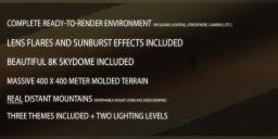Need a beautiful desert landscape? Need rolling desert mounds which stretch miles into the distance? Infinite Sands is a complete environmental package, fully plug-and-play for instant rendering out-of-the-box. You get everything pictured in the promos, including lighting, 8K skydome, movable footprints, lens flare effects, dust clouds, atmosphere, and cameras. Any of the promos can be reproduced in minutes by simply loading the respective camera and pressing ‘render.’The massive molded terrain measures 400m x 400m square, so there is plenty of landscape here to tell your desert story. And the footprints can be moved freely, according to the position of your characters. Everything is surrounded by real 3D mountains, cloud alpha cards, and a beautiful 8K skydome, for a seamless transition into the distance.