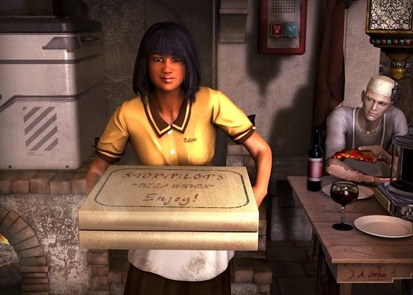 I think there may be more to the story of the pizza chef and the waitress. At the very least, both of them have had versions of themselves appear in a number of my renders. The girl is named Kimberlina and the chef is Android Boy.