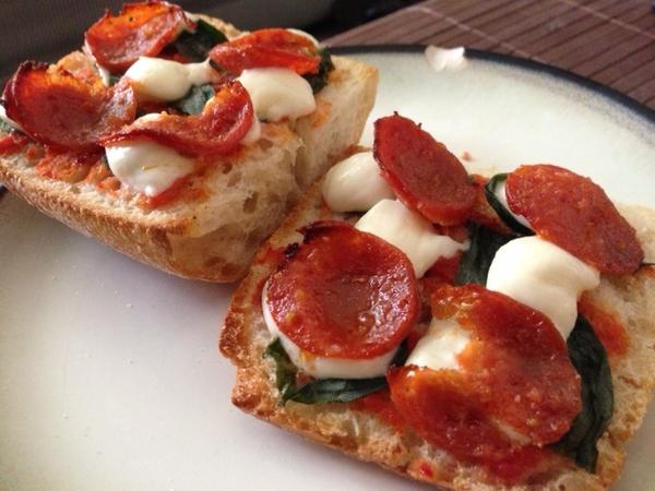 put these things together like a pizza and put them in a toaster oven (or real oven) for 3 minutes or so. tasty!
