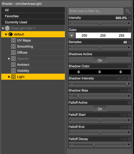 Overall there's about 7 lights that are active in the scene. 4 are Advanced Spotlights in the village, spaced about with falloff turned on and tagged as Foglights. Screenshot of their settings below. There's also 1 Advanced Ambient Light there in the village, also tagged as a foglight, and set to a very weak intensity of 6% - I wanted it to trigger a subtle sphere of light around the village to make a kind of overall village glow.