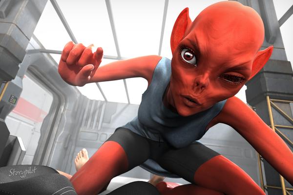 Kind of arrived at this image gradually, I thought of the framing first, and searched for a pose that would give me a good crouched down starting point and tweaked it... at the same time, I wanted to do some creature creator things and try a red skin. Then decided to actually have a person beneath, and slowly figured out the setting, which really started to make the picture different from my original idea. At that point it was a little strange, but I thought it could maybe go further and, well, I ended up here...
