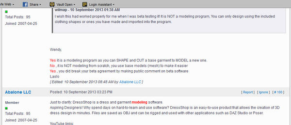 And regardless of that, it doesn't change that the store text, and the first several pages of the thread CLEARLY explain (and if you still were stumped, the documentation and videos were online) what he said from the start, and repeatedly, that this program was for modifying pre-made meshes. So no, that first commercial post doesn't say modeler. And I truly hope you're not going to be so adamant about not using the word "modeler" or models that it would offend if i say "hey look at the model dress I made" because you'd end up saying "that's not really a MODEL." I feel like that's what you're trying to say, that what we do is less 'real' because its from pre-made starter meshes. Hope what I just said makes sense.