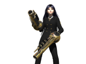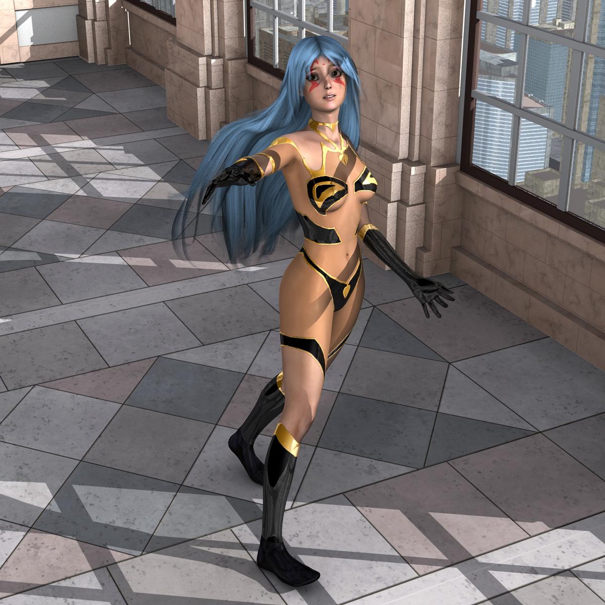 I have used Aiko 3 once again and a heavily modified version of Lady Sythe's Macross for V3, A3, SP3 second skin. I edited the second skin to make it a little more like the original costume, creating three layers: the sheer leotard, the black bra, panties, etc. and the gold trim. I then used the shear component applied directly to the character's diffuse skin map, and the other two were used on two nested geoshells to recreate the outfit. Separate material settings could then be applied, along with a new displacement map I created for the gold trim. Not perfectly executed, but it did the job.