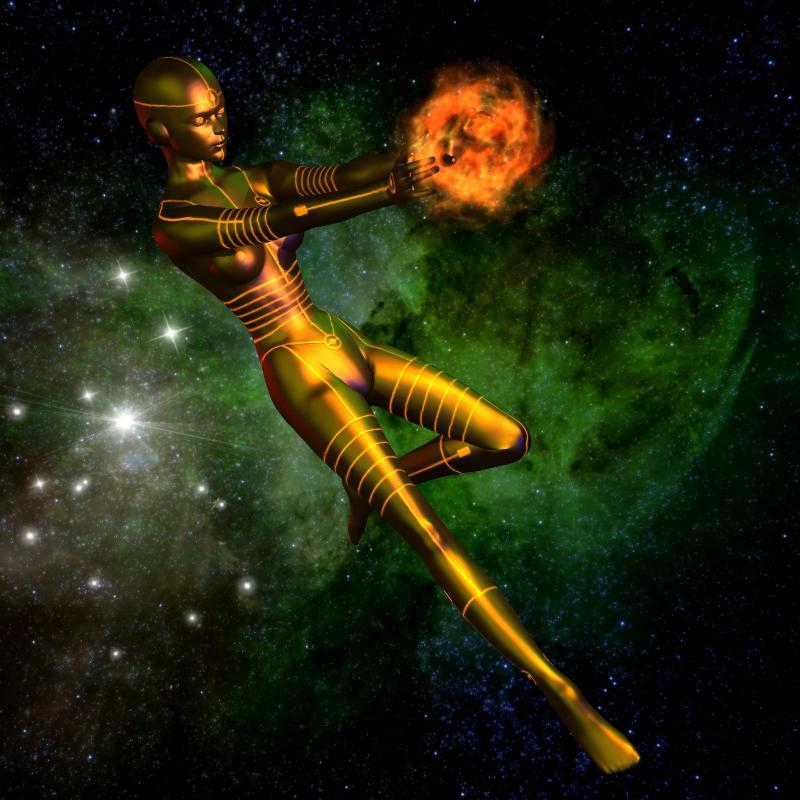 I decided to load the original Aiko. Using an image editor, I played with the bump maps for the included robot motif, making so that the "gtooves" could "glow". Then I applied the included "Boom!" pose, added a "plasma" energy prop, some appropriate lights and Coflek-Gnorg's "Space Sphere".