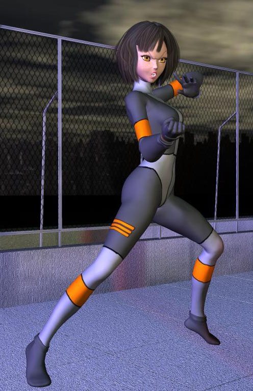 I used a node based arrangement of textures (diffuse, transparency, specular and displacement) that SamTherapy once offered. His setup allowed one to use a favorite skin texture meant for the Mil' 3 figures, like Aiko 3 as depicted here. I modified it so that she'd have a "up flipped" collar of actual geometry instead of the texture based approach Sam supplied.