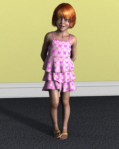 I'm back with a new and better render of my 5 year old girl. She has new hair (Taylor Hair), some Aiko5 added to her head, some breast morphs to flatten her as much as I could. (They are developing early these days, but I don't think it has come down to 5 yet!) Oh yes, and she has some freckles thanks to Zev0's skin overlays. Thank you all for your suggestions.