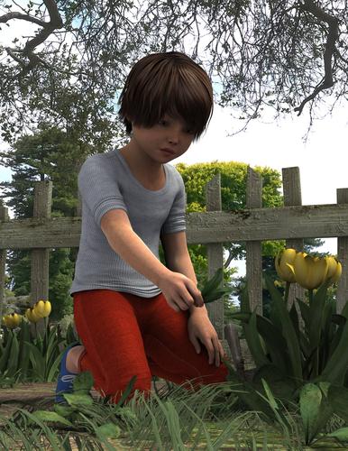 I have one solution for the "early development" problem. Here I started with the basic grey Genesis figure. Then I used the Head only slider for the Basic Female (no reason to give her a female body if she's gonna be 5 - the generic Base Genesis is fine) and used the Growing Up 5 year old preset.. Then I added the skin, clothing and hair, gave her some freckles with Overlays, posed her and gave her a smile.
