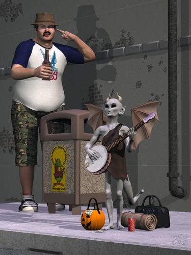 Hey dere...Halloween's a crazy time, y'know? Take dis li'l guy f'instance...all dressed up, singin' his heart out 'bout nutin' in paticular tryin' t' make a few extra bucks. Cute costume, though...