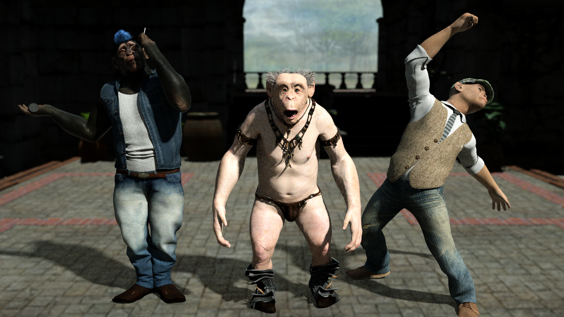 it's rendered in Octane and they are dressed and morphed 50% with other characters so not full chimp but they have no fur
