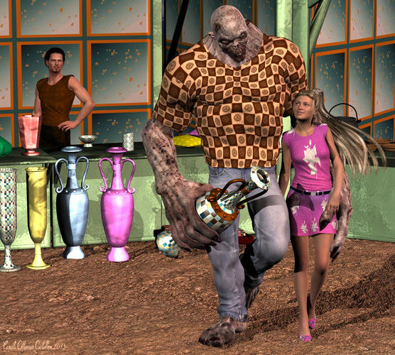 I've used my own shaders on all items in this scene with the exception of skins and hairs on the figures, the jeans on the fiend, the belt on her skirt and the ground.
