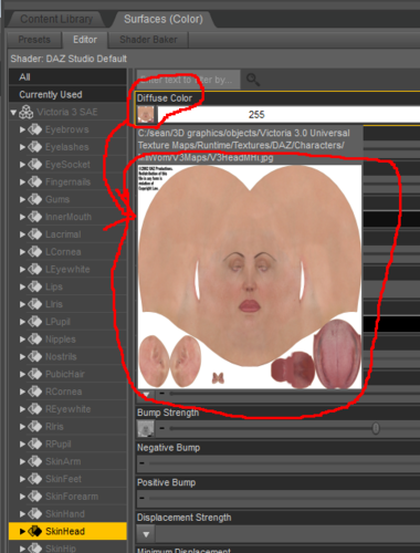 Sorry, I wasn't quite clear with my screenshot request. With the Surface Selection tool activated, click on the face to select the SkinHead surface, then in the Diffuse parameter, hover your mouse over the thumnail icon of the texture that is used so it displays nice and large so we can see it clearly. I want to see if it looks correct, or if it looks like somehow an obviously incorrect image has somehow been applied to this surface, like maybe a body or hair or an eyeball or something instead of a head. For example, this is what I see when I do the same for a randomly selected character that is working as expected: