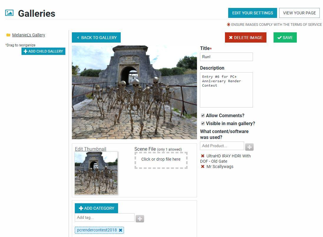 Once you have added an image, click on the small picture and you get into an edit screen where you can add a title, a description, give a list of products used (at least for those in the Daz store) and add any tags (some contests require these).