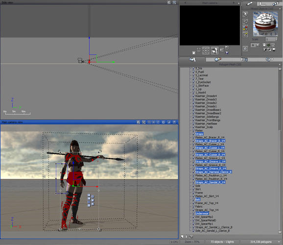 Thanks for the images, I forgot that it might list the separate materials in there. However, I did quickly do a comparison and the .obj is so much easier to work with. The images below show the .obj and the .pz3 version of the same setup. In the .obj things are listed much better, meaning that I can select all of one particular thing -in this case, straps- and edit them all at the same time. The .pz3 has the skirt selected (Hip). In the material preview window it says there are 4 parts to the skirt, which is right. But each part would have to be edited separately as they're not using the same material. Whereas, in the .obj, the parts for the skirt are listed already, and as the belt part of the skirt and the underwear are both leather, I can change them at the same time as the straps, as there is only one diffuse texture map with this outfit.
