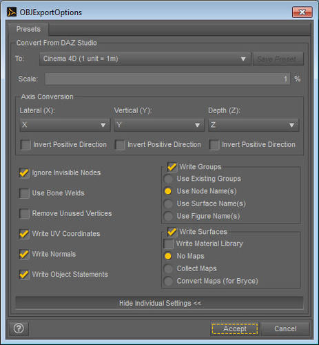 I just tried the OBJ format, it did not work very well. I use the stettings (shown below). I also tried FBX, this one gave me better results