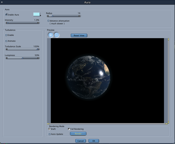 The root of this thread was to discuss the pixelation which is showing up beneath the aura in a planet tutorial I have posted over at Renderosity. I am a little surprised that nobody sent me a message concerning the tutorial in the first place but no biggy.
