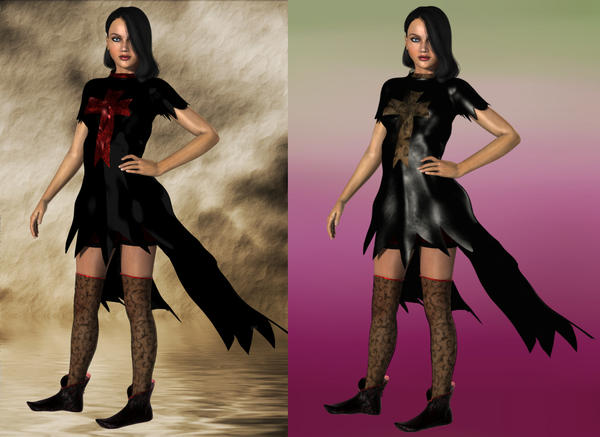 Top (with the cross material zone, for easy shader use), shorts (with edges material zones), stockings (multiple material zones) and boots all made in Dress Shop and Daz Studio. Not shown, but there were also gloves and a hat.