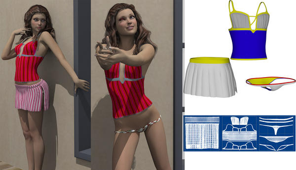 Please consider this my entry, in the event I cannot complete the extra items I have planned for it in time. These three items were modeled in Modo 601. I have some slight fitting errors to correct, and detailing I would like to do, but the base forms are complete. The set consists of One (1) pair of low leg panties (popular in Japanese manga), One (1) soft pleated skirt, and One (1) Top. The images to the right show the separation of MAT zones, by item, and the image on the bottom right shows UV layout. The items were modeled with edge and poly flow in mind, so deformations can be handled a bit smoother, and use only quads to be able to apply the subdivision modifier in DAZ Studio without deformation or artifacts to the mesh.