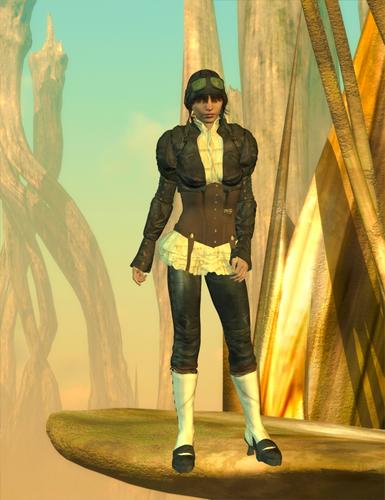 Going through my library trying various things and categorizing my Gen 4 stuff, how its organized completely stumps me so I move everything together in one folder with subfolders andin doing so decided to try V5 in some V4 outfits.This is B25 Steampunk Aviator autofitted to V5 Xiao Wen. Everything fit well even with various poses, ecept the boots are a bit funky, not bad tho...for the boots I used the SRMS boot fit V4. The background and lights are from Chaotic Realms