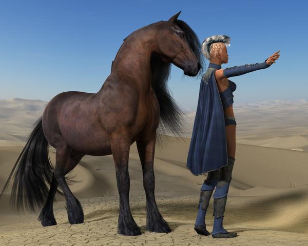But try out a summer sun type of light (prolly would reflect of the horses fur abit as well).... this morning I could barely look out of the window the sun was so bright and I dont even live in the desert :D Just an idea tho.. the most important thing about it is that you like the picture in the end