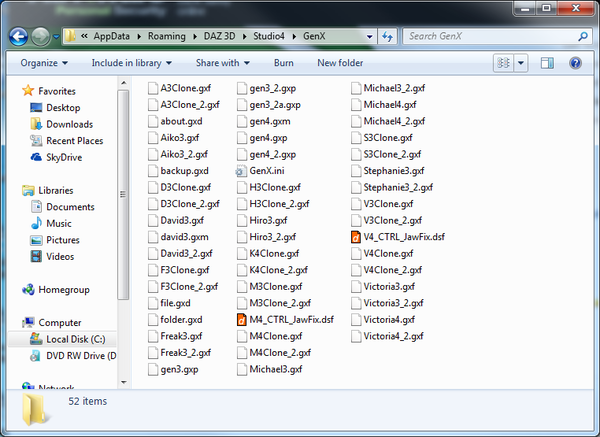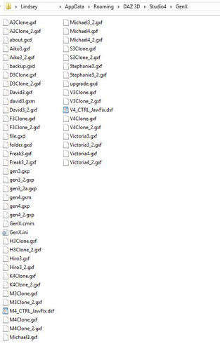 I have DS4_D3DGenx_1.2.0.0_Win64.exe installed and am using Daz Studio Pro 4.6. My Destination Folder for the GenX install is c:\Program Files\Daz 3D\DAZStudio4 I'm using this all on Windows 7 64Bit. My Daz Library is at C:\Users\Public\Public Documents\My Daz 3D Library All Gen4 characters work perfectly (V4.2, M4, F4, H4, A4, etc) and all Gen3 characters throw the clone not found error. The error doesn't give any indication as to what folder it is looking for the files in. The documentation doesn't say which folder it should be installed in.