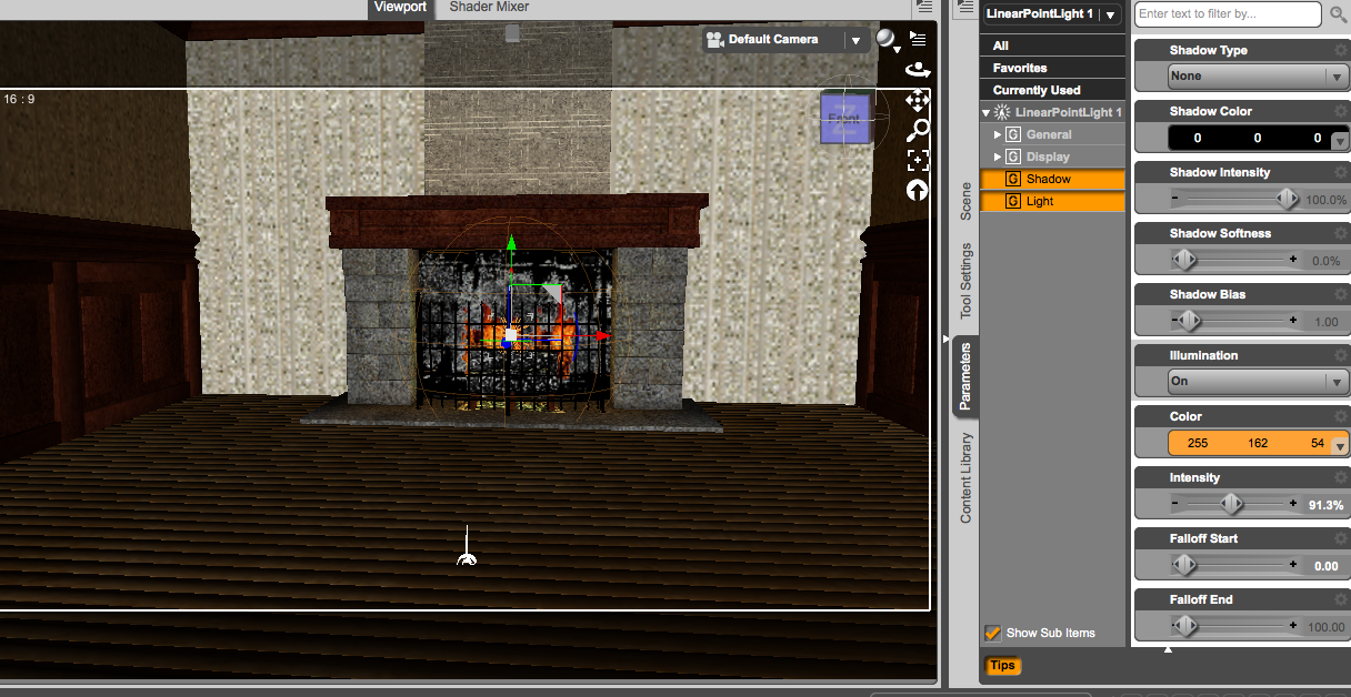 Applied the Uber arealight to the flames. Plugged the diffuse map into ambient color, same map into color, which means emitted light color. Enabled fall off, otherwise the light would spread with the same intensity infinitely. Made sure shadows are active, disabled accept shadow, as they don't need to have shadows cast onto them. Upped light intensity to 2000. Since in this case the flames are a flat plane with normals pointing outward, they only emit light in that direction, fixed that with a linear pointlight as teh screenshot illustrates. For simplicity I didn't add any other lights to this example.