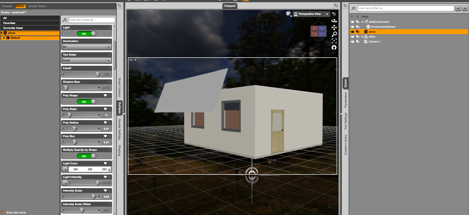 3. Add some light source so you don't have to work in the dark:) You can delete them once you have set up the lighting, or you may want to keep them, I suggest loading one or more of wowie's light emitters (content library/light presets/wowie) When working with awe, you will use the included PT area light shader to light up your scenes. This shader is also in wowie's shader presets folder. It is highly optimized for speed/performance with the pathtracer, and is really all you need. As I mentioned, the standard DS light and AoA lights will work but rendertimes will basically double. Get used to using the arealight shader. Of course you can use HDRI lighting, but as we focus on indoor scenes let's use the arealight for now. Wowie's light presets are very simple. It's a pivot point with a plane parented to it. The plane has the PT arealight already applied to it, you just need to place it by moving and rotating the pivot, and adjust light intensity according to your needs. (Select the emissive plane, adjust light intensity in the surface tab)