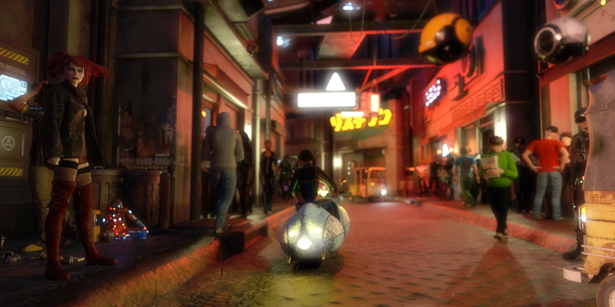 I used the Now Crowds Billboards - Future Life and Now Crowds Billboards Modern city Life. The bill board figures are the ones mainly in the back furthur down the street, they are so useful I've found for filling up a scene without taxing my computer. I only picked them up recently but will be using them a lot more, when mixed with full figures and lo res figures it should be possible to get a very populated scene, something I've not been able to do in the past without rendering in bits this was rendered in one go the only reason its a small size was time rather than anything else, I did do one version on a larger scale and my Graphics card was able to handle it. But I didn't like the lighting and so wanted to redo it. I meant to render it while I was at work today but forgot to press the render button before I left so have to do it this evening in between getting dinner so it had to be the smaller dimensions.