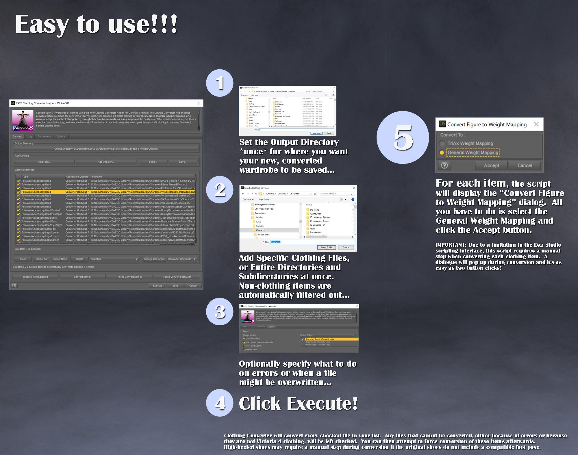IMPORTANT: Due to a limitation in the Daz Studio scripting interface, this script requires a manual step when converting each clothing item. A dialogue will pop up during conversion and it's as easy as two button clicks!