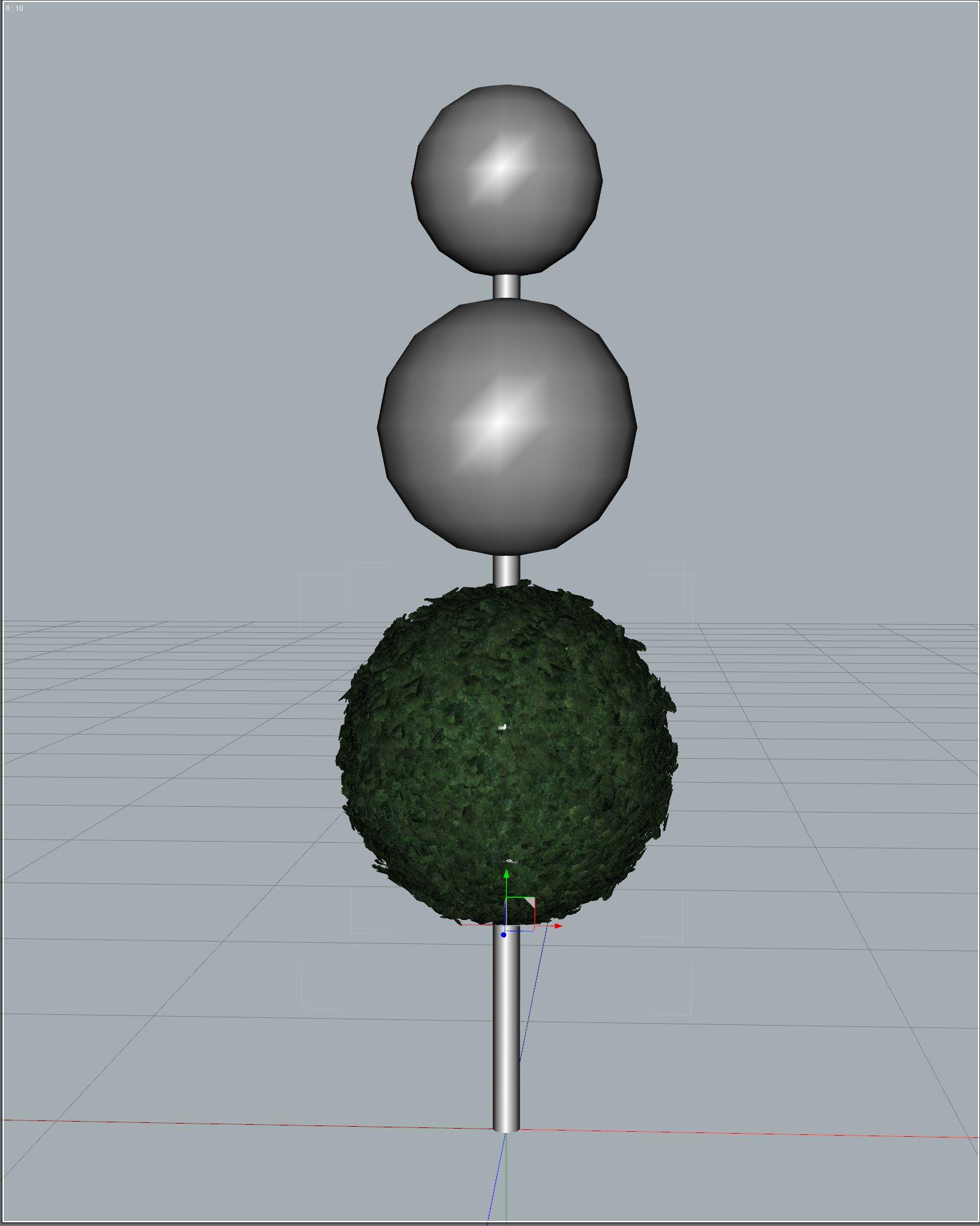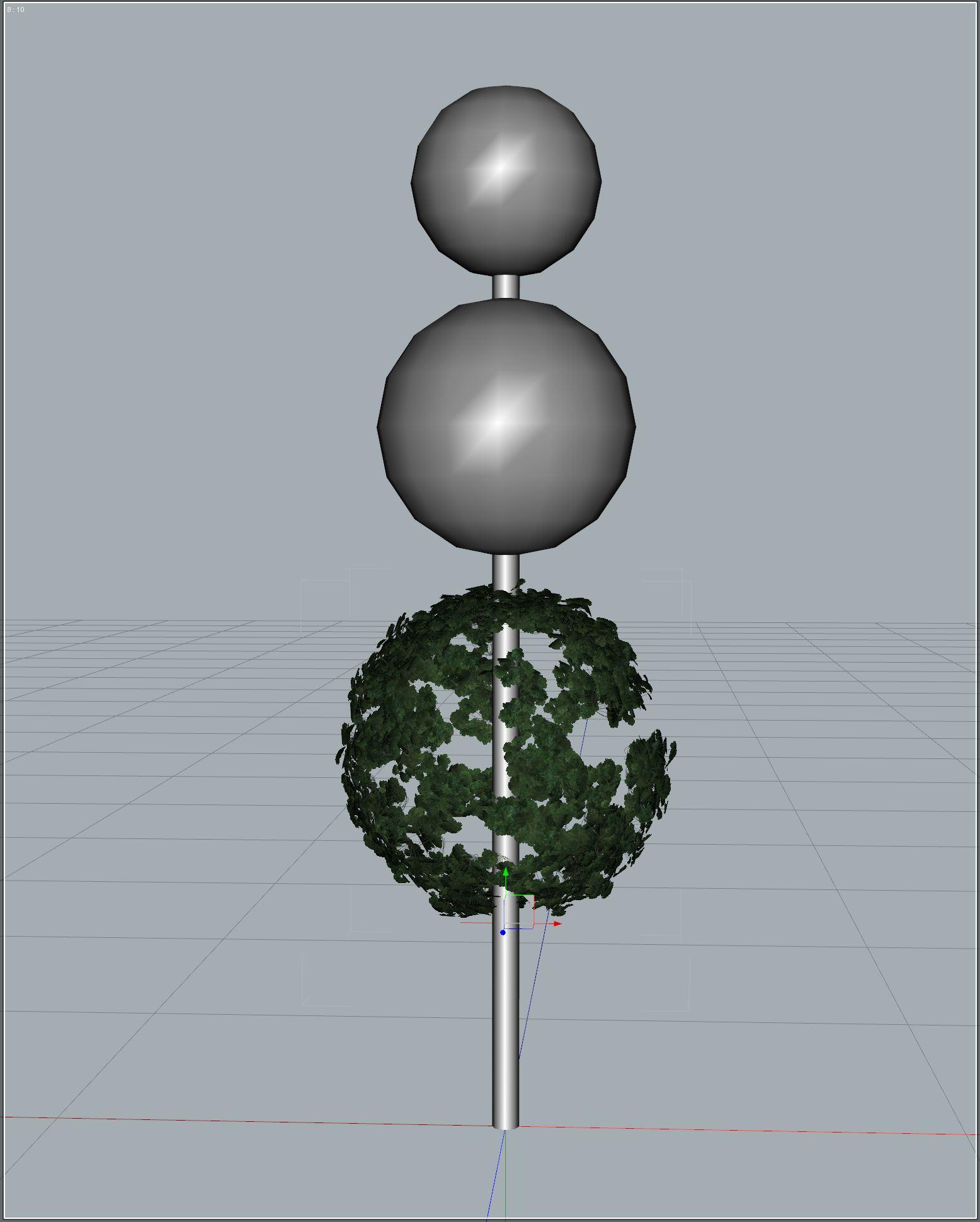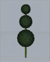 I want to create fancy topiary trees. I thought I'd start out with a simple one made of a cylinder primitive for the trunk and three sphere primitives for the stacked leaf balls. This will give me a feel for what needs to be done for a fancier tree. I am going to give you the play by play, including what didn't work, and how to fix it. In the end, this is my tree. All of the images are much larger than displaed here. Click them to view a larger size.