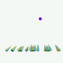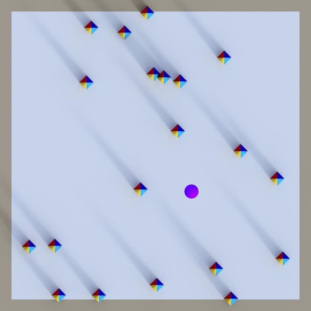 Looking down from the top with an orthographic view, we can see that all instances are rotated so that their front (point where yellow and turquoise faces meet) now point at the sphere. The instances are still vertical (clamped Y axis).