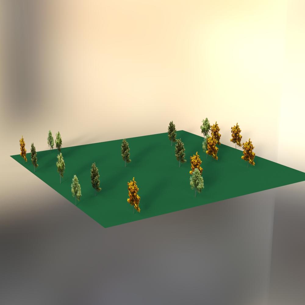 2) Suppose you use some billboard tree instances to populate the background of your scene. But your camera angle is not from the front, or you keep changing your camera angle. Use Point At alignment and Clamp Y Axis with your render camera as the object that Point At points at. Every time you change your camera angle, just rescatter, and all the billboard instances will rotate to face your camera. Here I used tree billboards from Ecomantics - Efficient Ecosystems.