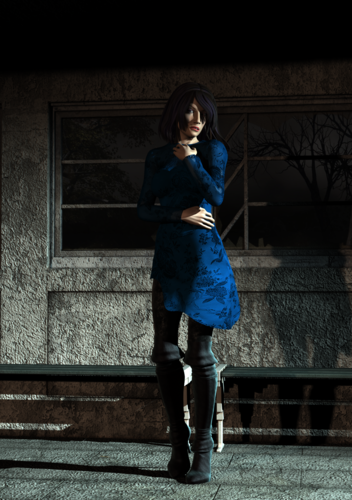 Second image is DS 4.8 iray render after all materials and lights had been converted over. I have to say, I love the way they both turned out. I did have to lighten her boots so they weren't a solid black mass. Her dress turned out darker but that isn't that big an issue since it is a night shot anyway.